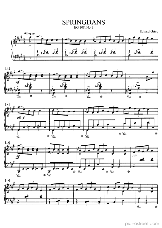 No 1. Springdans in A Major by Edvard Grieg. Sheet music and recordings of thousands of piano pieces by Edvard Grieg and many other famous composers to view in your digital device, print out or listen to.