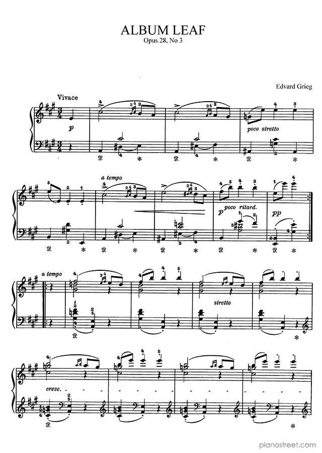 DOWNLOAD: Edvard Grieg - Vivace Op. 28 No. 3 in A Major ( from Album Leafs by Grieg). Piano sheet music to print immediately or to view in mobile devices.