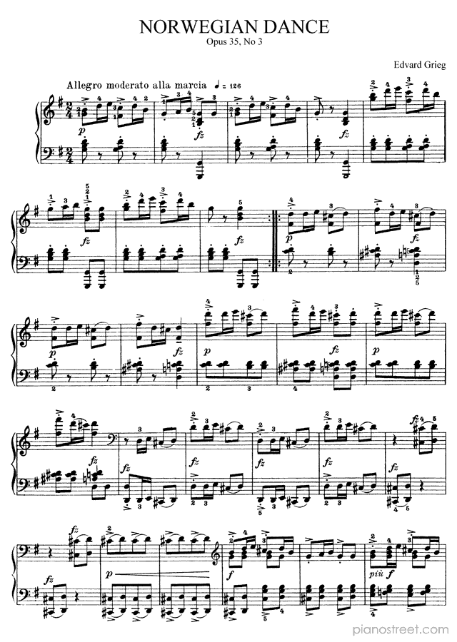 Piano sheet music downloads and recordings. This piece is from Four Norwegian Dances by Edvard Grieg: Norwegian Dance Op. 35 No. 3 in G Major (published in 1881) . Level 7, Period: Early Romantic
