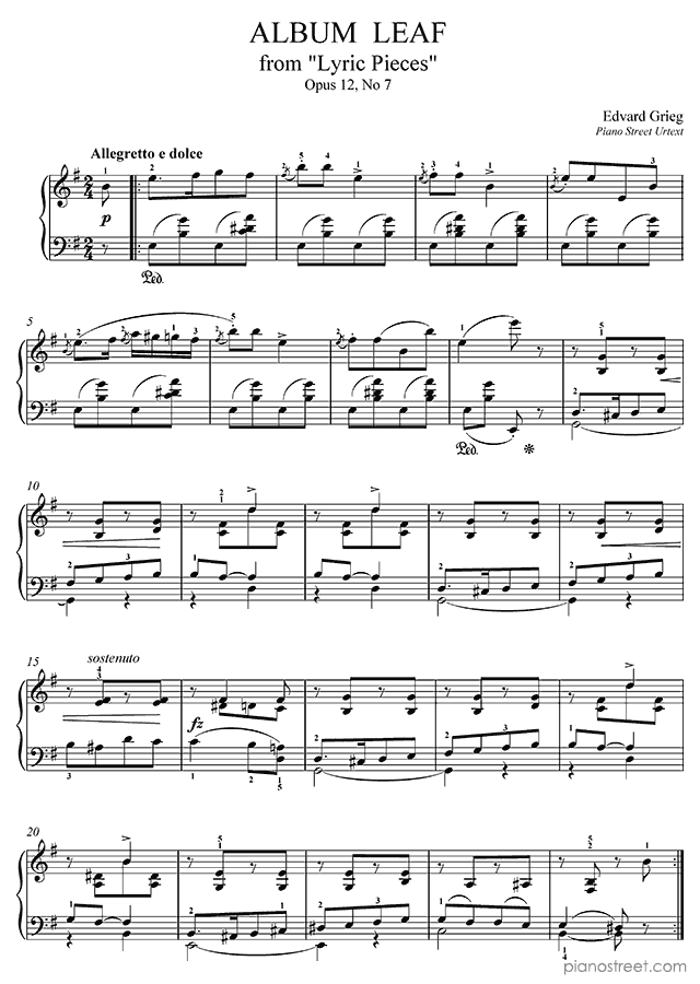 Downloadable piano sheet music from Lyric Pieces by Edvard Grieg to print: Album Leaf Op. 12 No. 7 in E Minor (published in 1867)