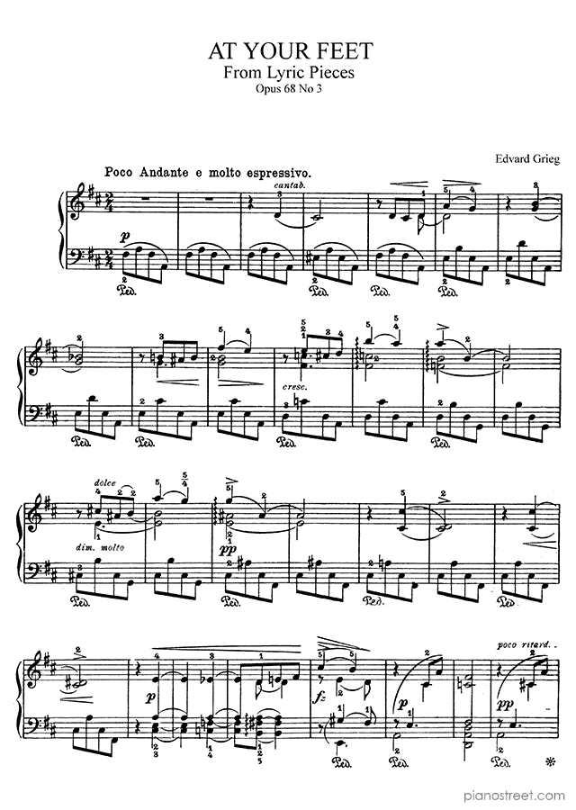 Early Romantic piano sheet music by Edvard Grieg to download and print instantly: At Your Feet Op. 68 No. 3 in the key of . Level 5, compositional type: Piece