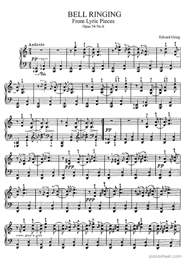 Piano sheet music and recordings. This piece is from Lyric Pieces by Edvard Grieg: Bell Ringing Op. 54 No. 6 in C Major . Level 5, Period: Early Romantic
