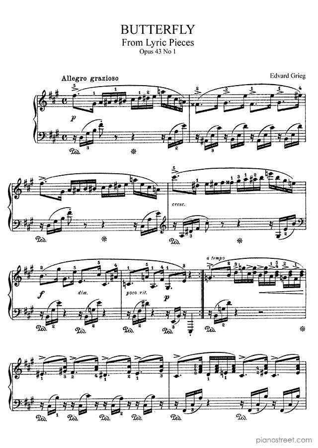 DOWNLOAD Butterfly in A Major Op. 43 No. 1 by Edvard Grieg. High quality classical piano scores from the Piano Street sheet music library.