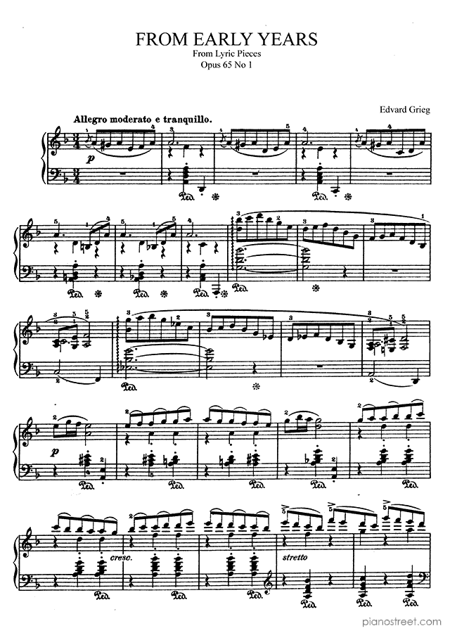 Early Romantic piano sheet music by Edvard Grieg to download and print instantly: From Early Years Op. 65 No. 1 in the key of . Level 5, compositional type: Piece