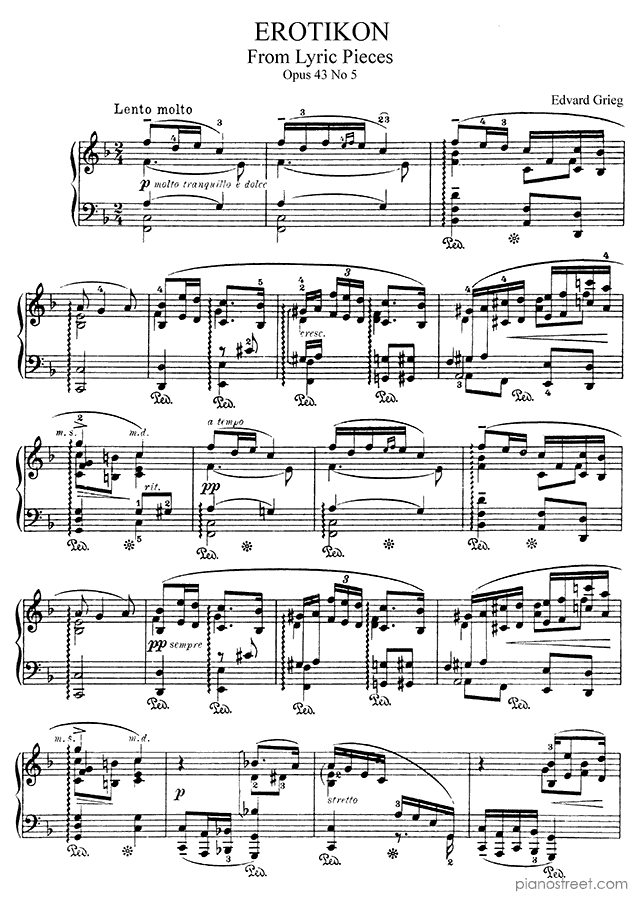 Piano sheet music and recordings. This piece is from Lyric Pieces by Edvard Grieg: Erotikon Op. 43 No. 5 in F Major . Level 7, Period: Early Romantic