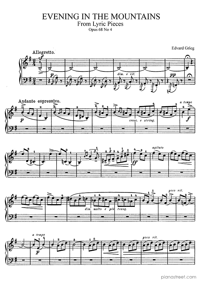 Piano sheet music and recordings. This piece is from Lyric Pieces by Edvard Grieg: Evening in the Mountains Op. 68 No. 4 in E Minor . Level 5, Period: Early Romantic