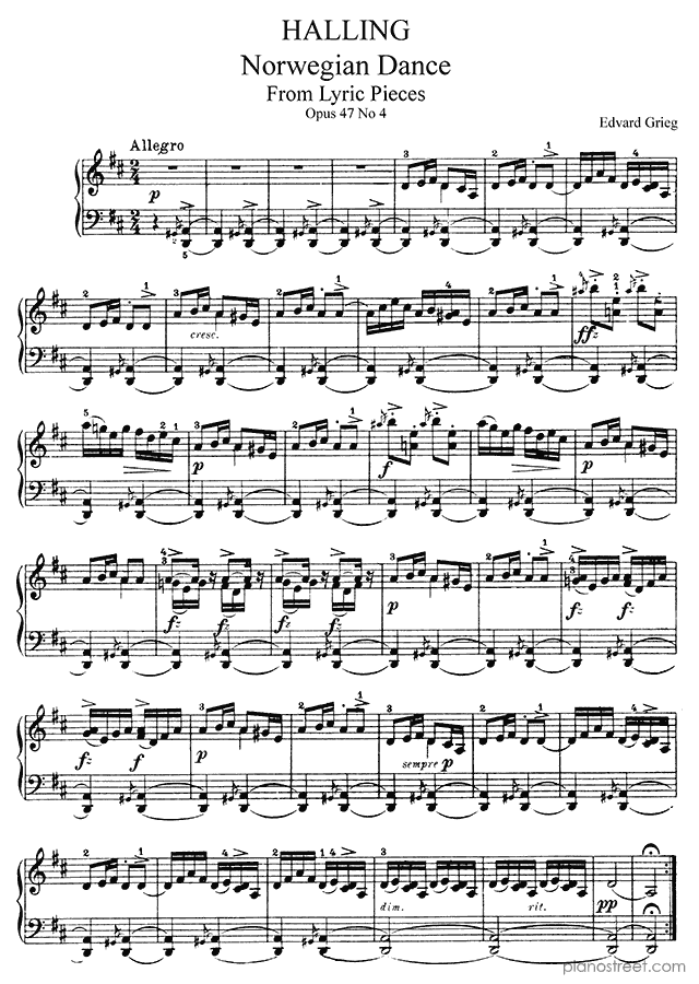 DOWNLOAD: Edvard Grieg - Halling - Norwegian Dance Op. 47 No. 4 in D Major ( from Lyric Pieces by Grieg). Piano sheet music to print immediately or to view in mobile devices.