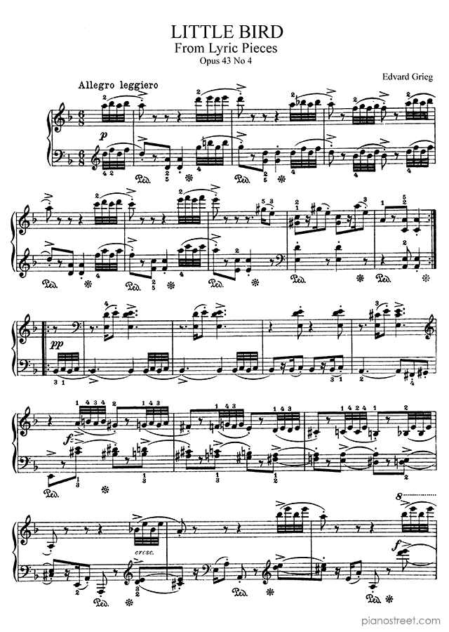 Early Romantic piano sheet music by Edvard Grieg to download and print instantly: Little Bird Op. 43 No. 4 in the key of . Level 6, compositional type: Piece