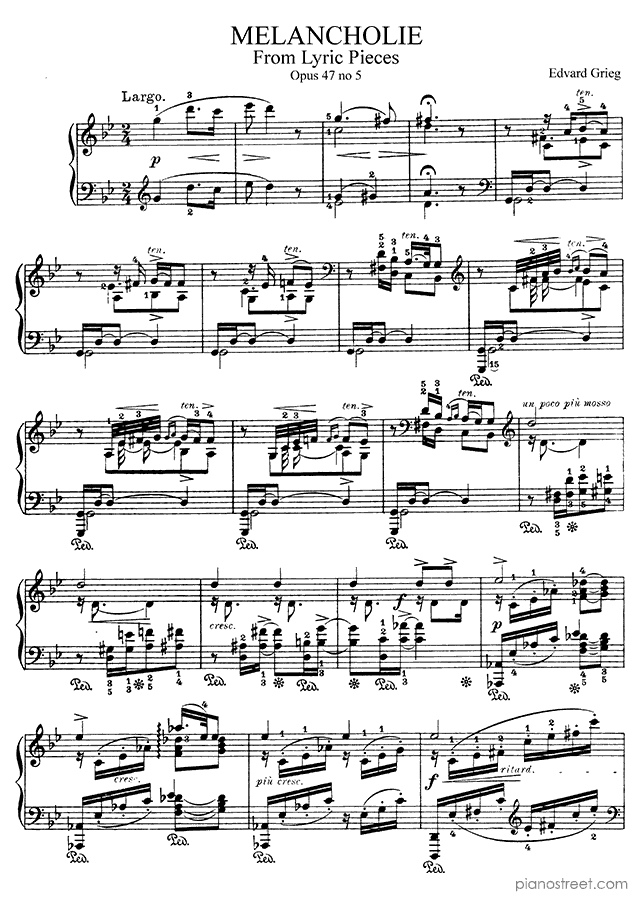 DOWNLOAD Melancholie in G Minor Op. 47 No. 5 by Edvard Grieg. High quality classical piano scores from the Piano Street sheet music library.
