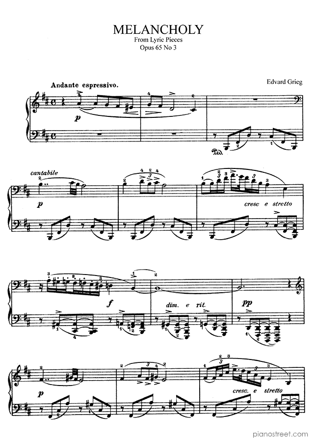 This piece is composed by Edvard GriegIt was written during the Early Romantic period. Title: Melancholy, Op. 65 No. 3 in B Minor from Lyric Pieces. The difficulty level if graded by ABRSM would be approximately 6 and it belongs to the Early Romantic period.