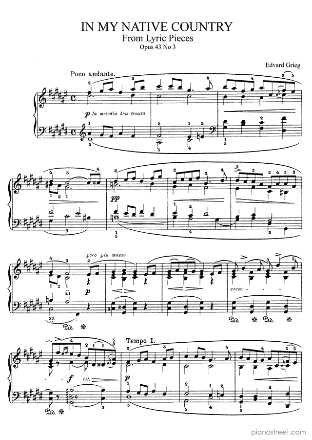 Classical piano sheet music by Grieg to download: In my Native Country Op. 43 No. 3 in the key of This piece has difficulty level 5 in the category Piece
