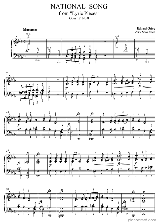 Classical piano sheet music by Grieg to download: National Song Op. 12 No. 8 in the key of This piece has difficulty level 4 in the category Piece