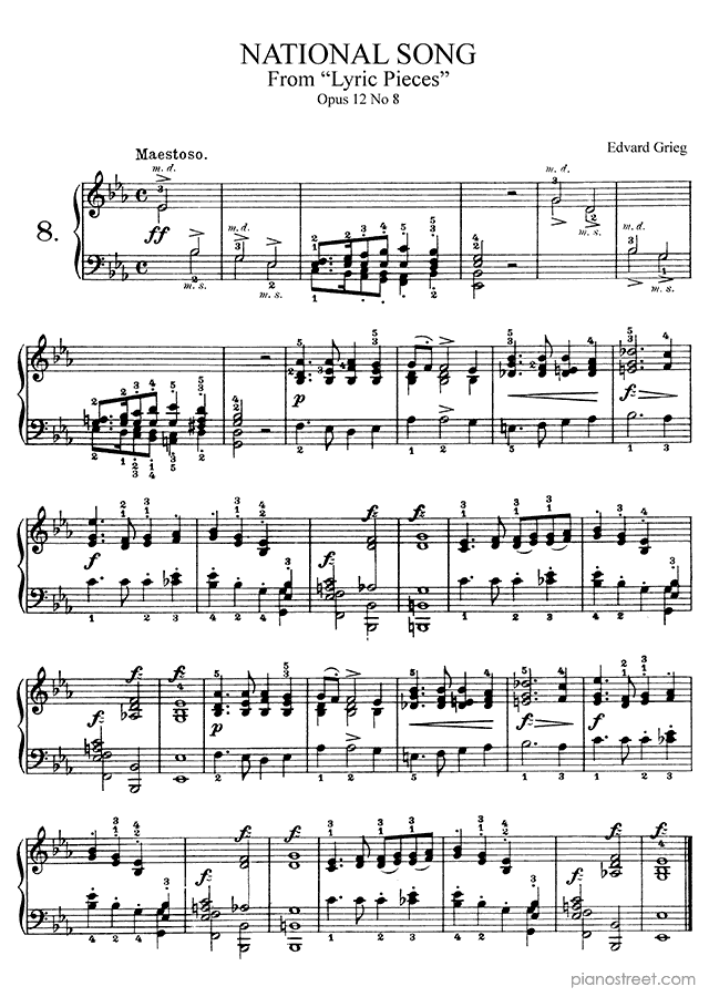 National Song Op. 12 No. 8 in E-flat Major, a composition by the early romantic composer Edvard Grieg who was born in 1843 and died in 1907. The piano score of this piece was first published in 1867 and is part of Grieg's Lyric Pieces.