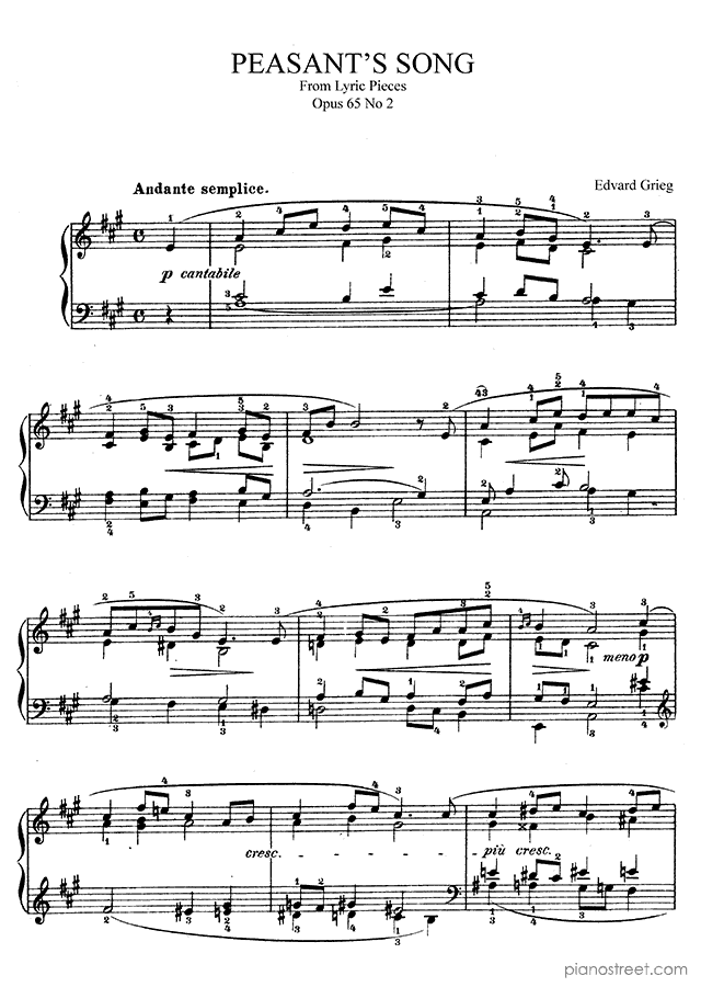 Piano sheet music and recordings. This piece is from Lyric Pieces by Edvard Grieg: Peasant's Song Op. 65 No. 2 in A Major . Level 5, Period: Early Romantic