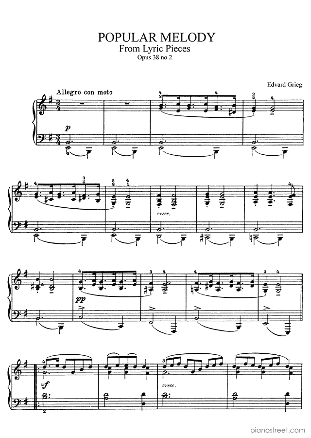 Early Romantic piano sheet music by Edvard Grieg to download and print instantly: Popular Melody Op. 38 No. 2 in the key of . Level 5, compositional type: Piece