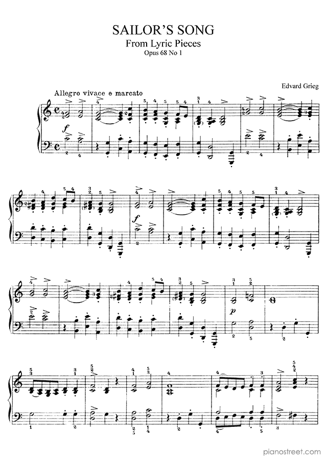 Downloadable piano sheet music from Lyric Pieces by Edvard Grieg to print: Sailor's Song Op. 68 No. 1 in C Major