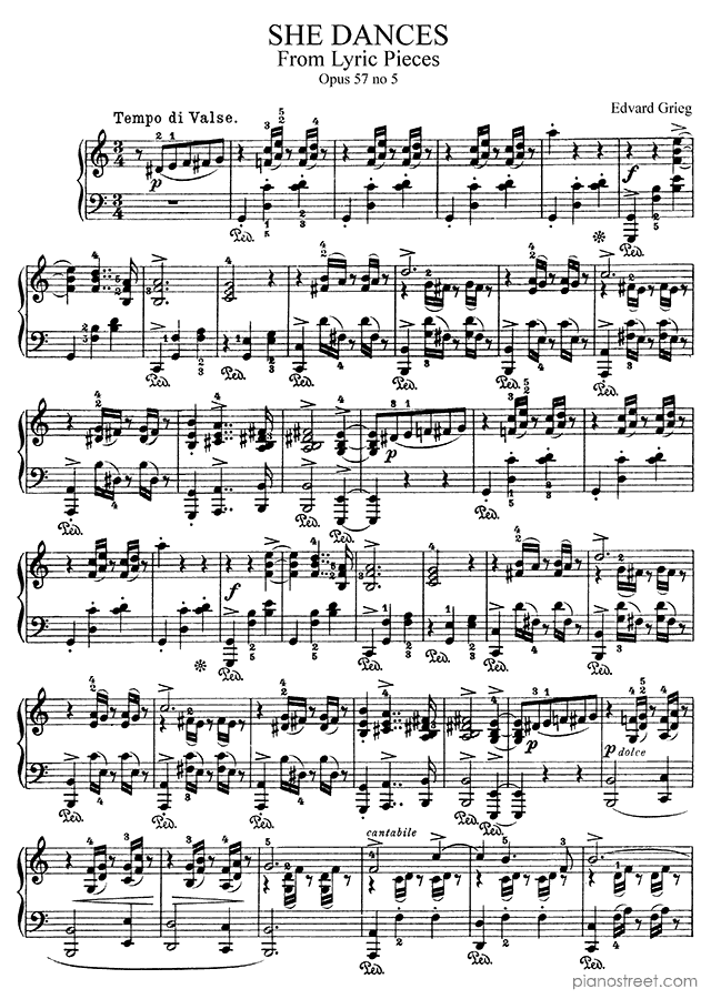 She Dances in C Major Op. 57 No. 5 by Edvard Grieg. Sheet music and recordings of thousands of piano pieces by Edvard Grieg and many other famous composers to view in your digital device, print out or listen to.