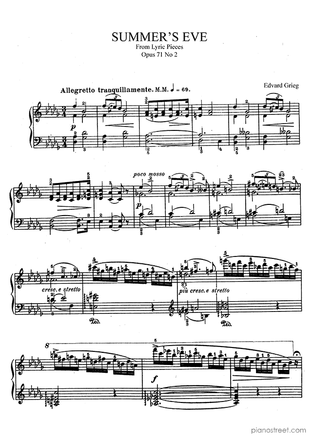 Summer's Eve in B-flat Minor Op. 71 No. 2 by Edvard Grieg. Sheet music and recordings of thousands of piano pieces by Edvard Grieg and many other famous composers to view in your digital device, print out or listen to.