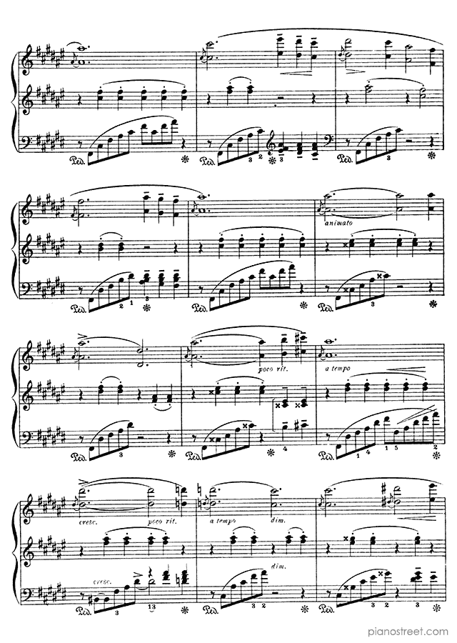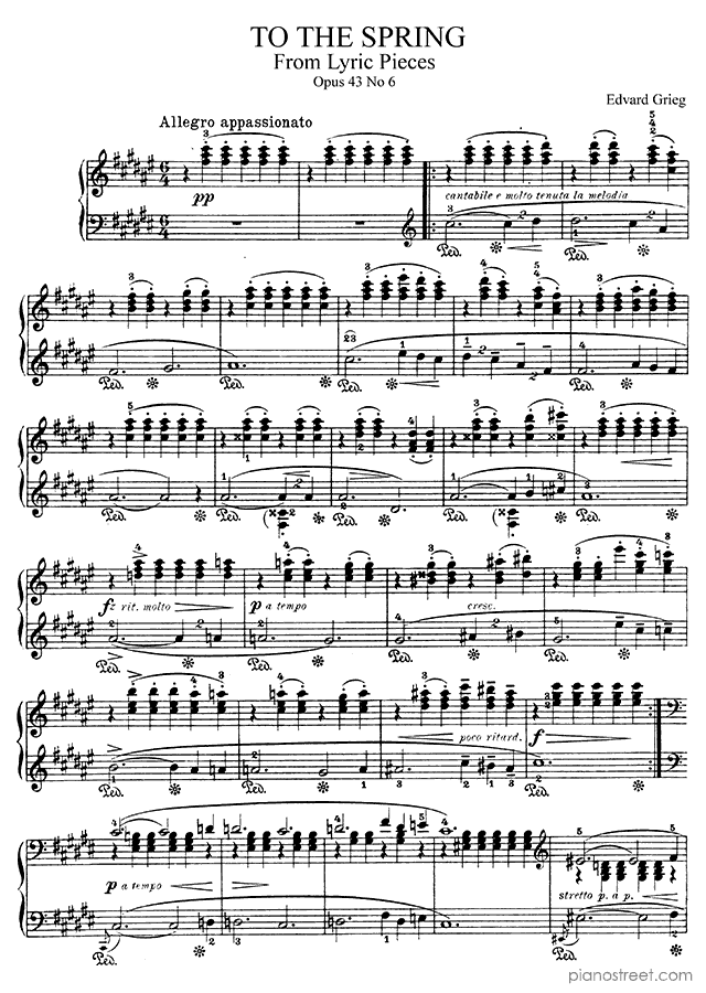 To Spring starts with a sweet melody that is superimposed upon gently throbbing triplets. Grieg tells the performer to play with passion, which at first seems to belie the bucolic nature of this little piece. But on the second page, the music builds up to a fortissimo climax, and when the melody is repeated, the triplets are moved to the right hand and complemented with agitated arpeggios.Background