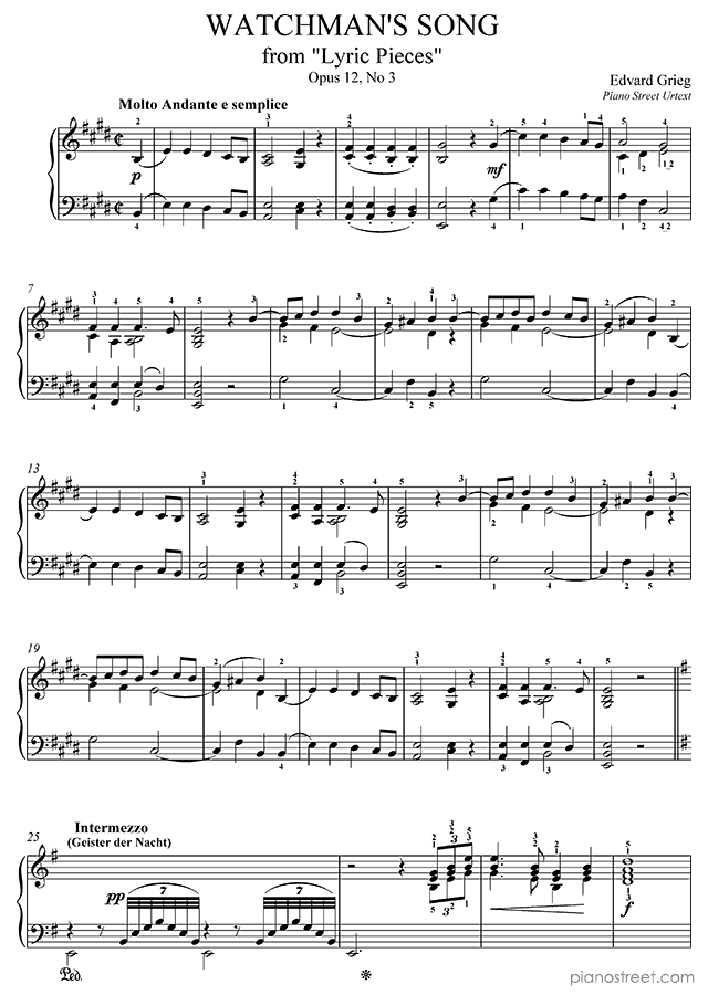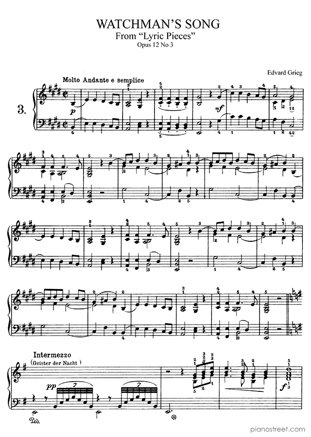 Watchman's Song in E Major Op. 12 No. 3 by Edvard Grieg. Sheet music and recordings of thousands of piano pieces by Edvard Grieg and many other famous composers to view in your digital device, print out or listen to.