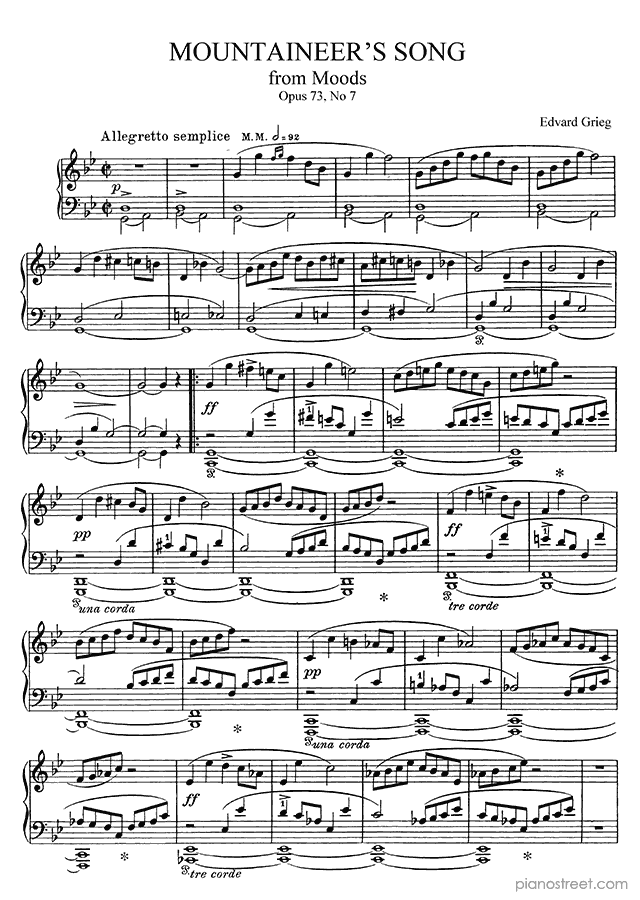 The Mountaineer's Song Op. 73 No. 7 in G Minor, a composition by the early romantic composer Edvard Grieg who was born in 1843 and died in 1907. The piano score of this piece was first published in 1905 and is part of Grieg's Moods.