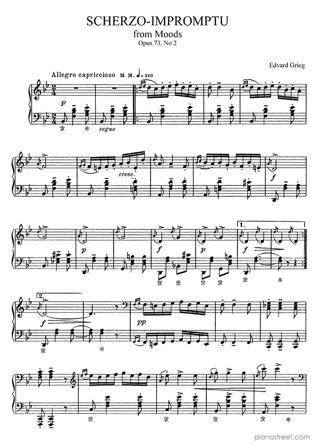 Scherzo-Impromptu in B-flat Major Op. 73 No. 2 by Edvard Grieg. Sheet music and recordings of thousands of piano pieces by Edvard Grieg and many other composers to view in digital devices, print or listen to.