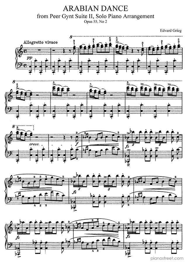 Arabian Dance in C Major Op. 55 No. 2 by Edvard Grieg. Sheet music and recordings of thousands of piano pieces by Edvard Grieg and many other composers to view in digital devices, print or listen to.