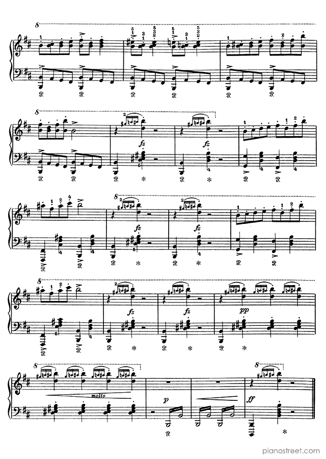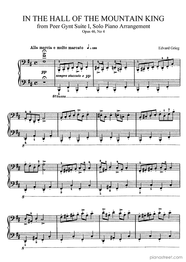Edvard Grieg: In the hall of the Mountain King Op. 46 No. 4 in B Minor from Peer Gynt Suites - piano sheet music to print instantly. This piece is level 6 and was composed during the Early Romantic period.