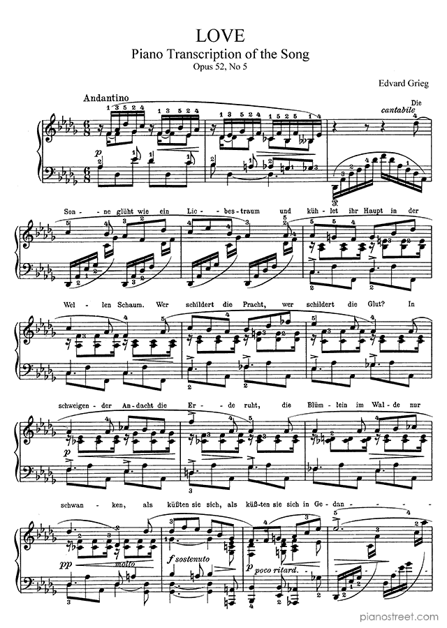 Piano sheet music downloads and recordings. This piece is from Piano Transcriptions of Songs by Edvard Grieg: Love Op. 52 No. 5 in D-flat Major . Level 6, Period: Early Romantic