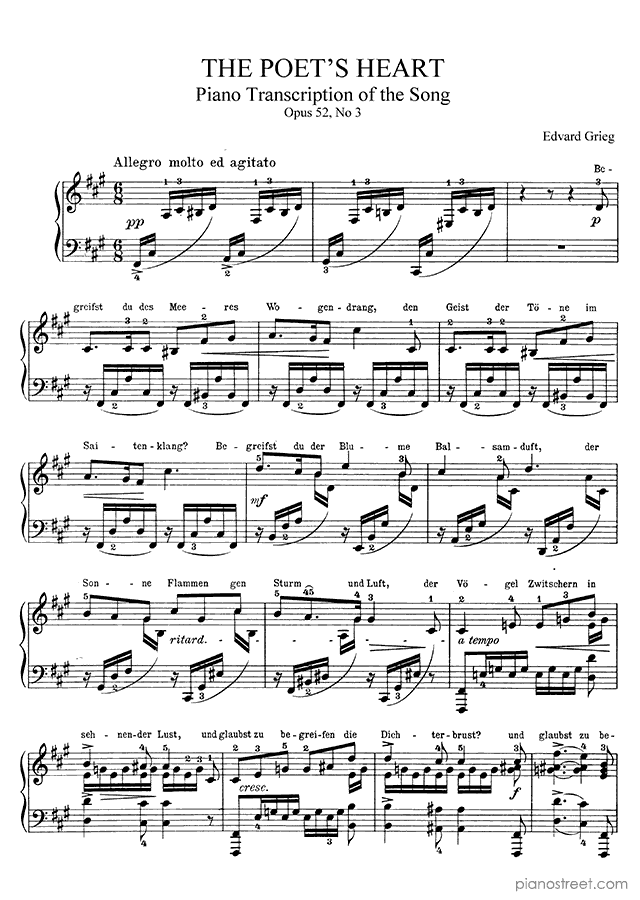 Classical piano sheet music by Grieg to download: The Poet's Heart Op. 52 No. 3 in the key of This piece has difficulty level 7 in the category Transcription