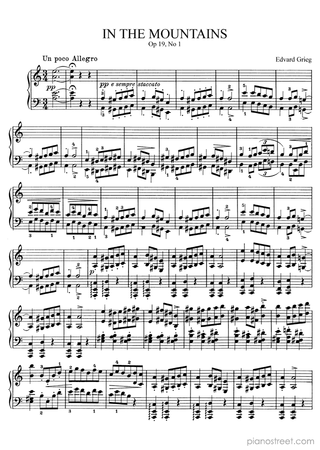 Downloadable piano sheet music from Scenes of Country Life by Edvard Grieg to print: In the Mountains Op. 19 No. 1 in A Minor (published in 1871)