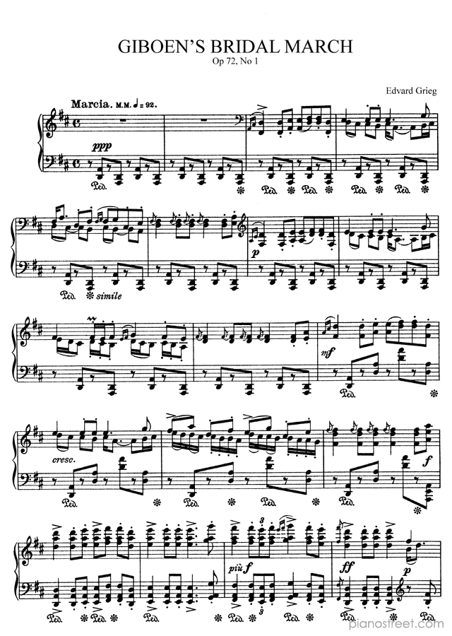 Giboen's Bridal March Op. 72 No. 1 in D Major, a composition by the early romantic composer Edvard Grieg. The piano score of this piece was first published in 1903 and is part of Slåtter by Grieg.