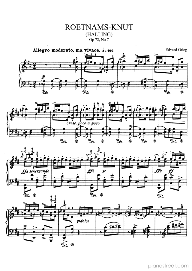 Roetnams-Knut (Halling) in D Major Op. 72 No. 7 by Edvard Grieg. Sheet music and recordings of thousands of piano pieces by Edvard Grieg and many other famous composers to view in your digital device, print out or listen to.