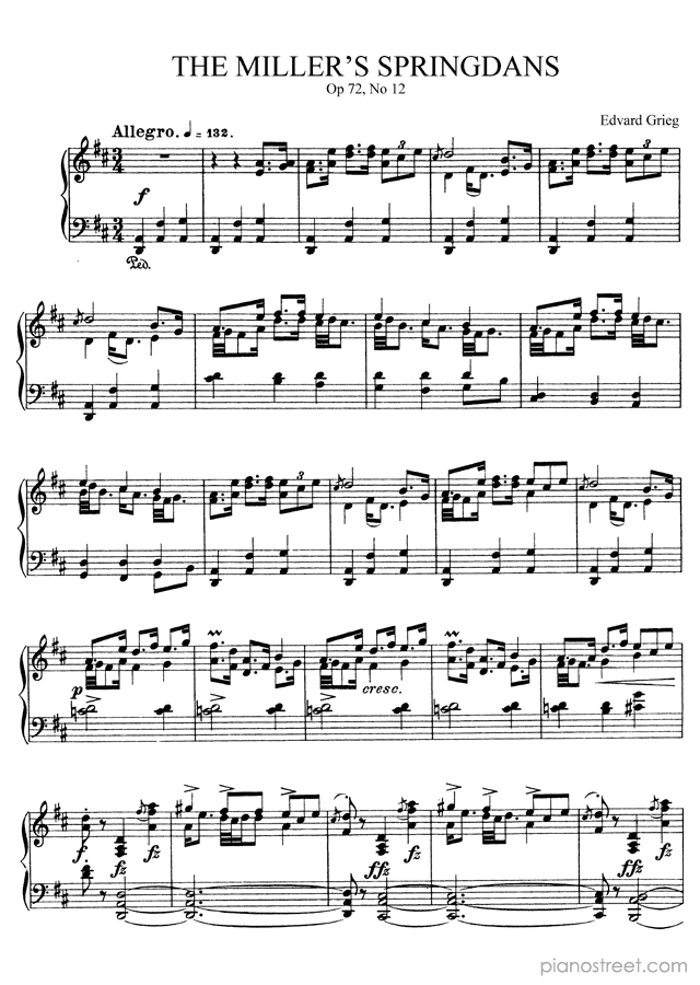 The Miller's Springdans Op. 72 No. 12 in D Major, a composition by the early romantic composer Edvard Grieg who was born in 1843 and died in 1907. The piano score of this piece was first published in 1903 and is part of Grieg's Slåtter.