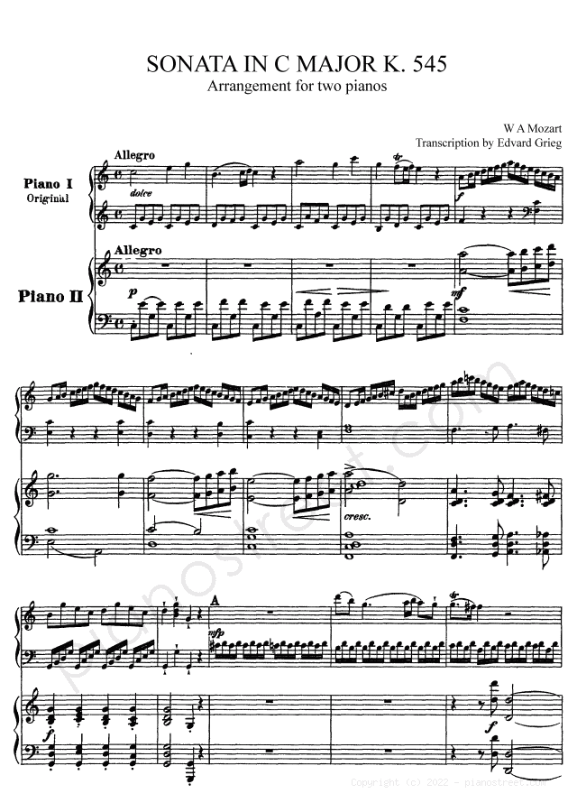 Grieg: Sonata K 545 by Mozart - arrangement for two pianos in C Major (published in 1877) . DOWNLOAD piano sheet music from Piano Street digital sheet music library.