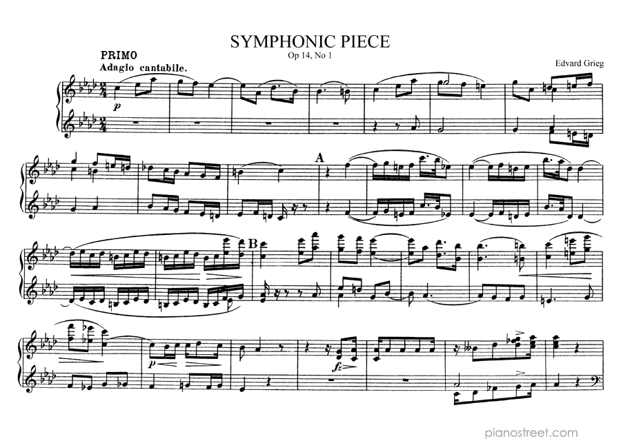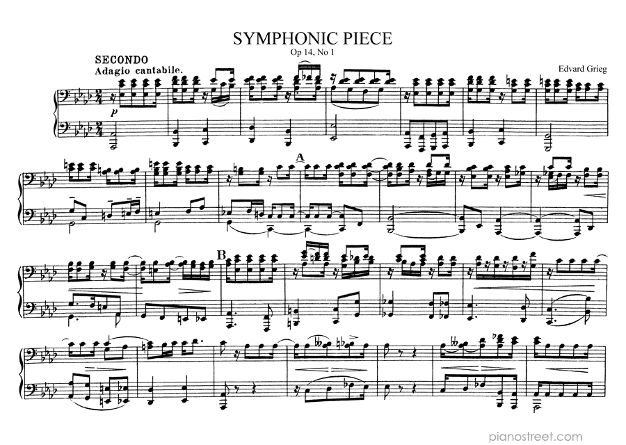 Symphonic Piece in A-flat Major - Op. 14 No. 1 is a piano piece by the early romantic composer Edvard Grieg who lived between the years 1843 and 1907.