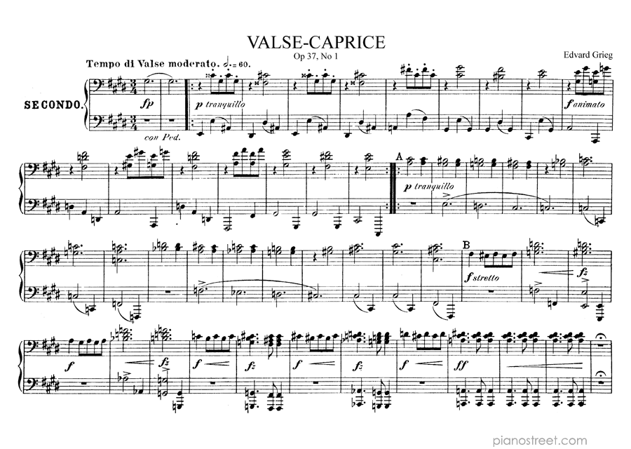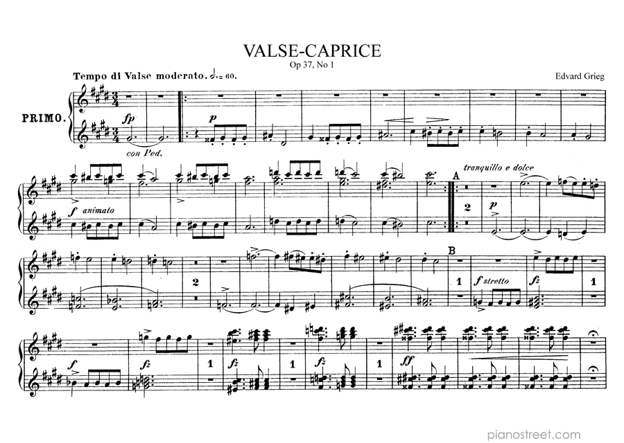 Grieg: Valse-Caprice (four hands) Op. 37 No. 1 in C-sharp Minor (published in 1883) . DOWNLOAD piano sheet music from Piano Street digital sheet music library.