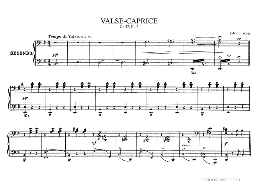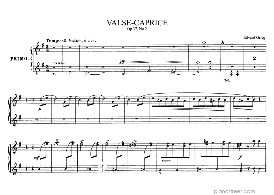 Valse-Caprice (four hands) in E Minor Op. 37 No. 2 by Edvard Grieg. Sheet music and recordings of thousands of piano pieces by Edvard Grieg and many other famous composers to view in your digital device, print out or listen to.