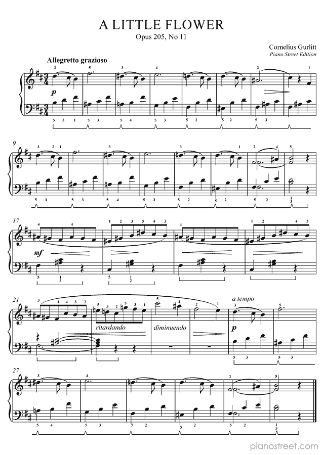 A Little Flower in B Minor - Op. 205 No. 11 is a piano piece by the early romantic composer Cornelius Gurlitt who lived between the years 1820 and 1901.