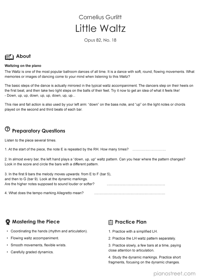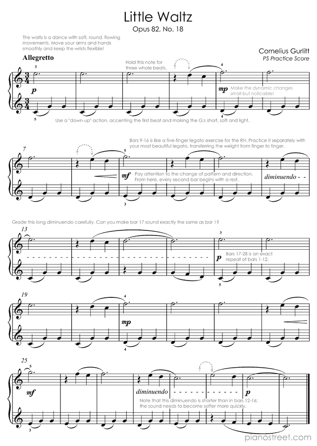 Early Romantic piano sheet music by Cornelius Gurlitt to download and print instantly: Little Waltz Op. 82 No. 18 in the key of . Level 1, composition type: Piece (published in 1877)