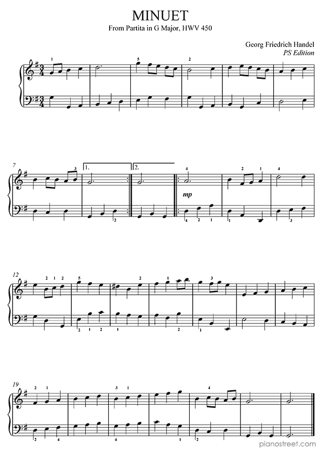 Piano sheet music and recordings. This piece is by Georg Friedrich Handel: Minuet in G Major . Level 2, Period: Baroque