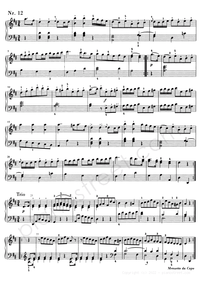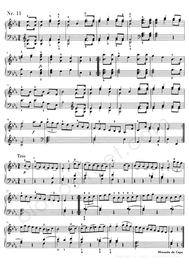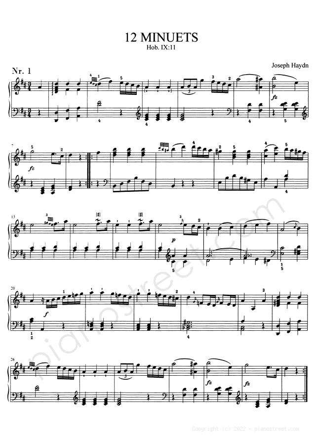12 Minuets Hob. IX: 11, by the classical composer Joseph Haydn. This piano piece was initially published in the year 1792 and is included in Dances by Haydn.