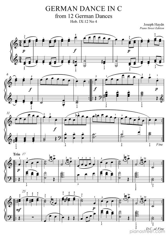 Classical piano sheet music by Haydn to download: German Dance Hob. 9 No. 12 in the key of This piece has difficulty level 3 in the category Piece