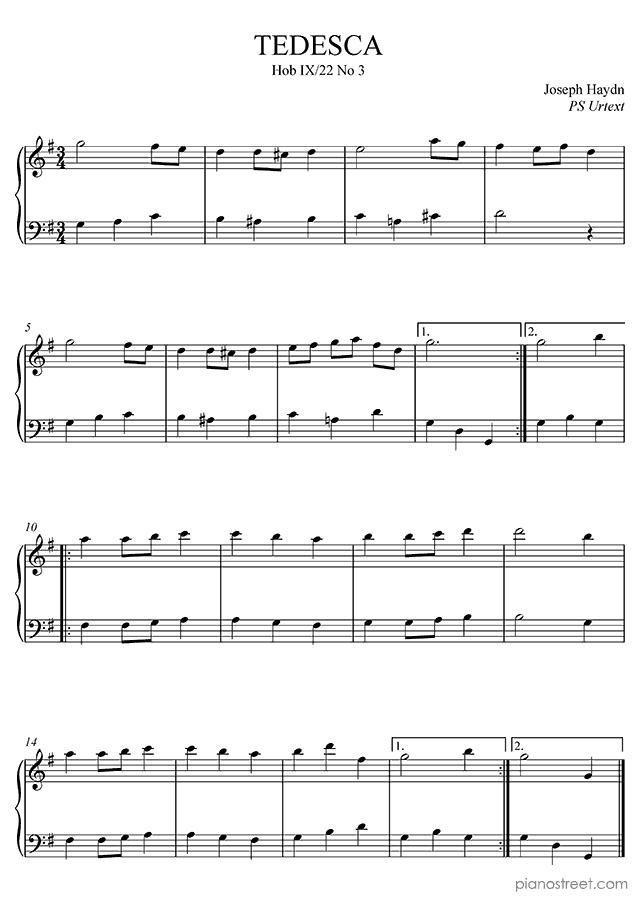 Piano sheet music and recordings. This piece is by Joseph Haydn: Tedesca Hob. 9 No. 22 in G Major . Level 1, Period: Classical