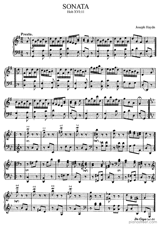 Downloadable piano sheet music from Sonatas by Joseph Haydn to print: Sonata Hob. 16 No. 11 in G Major (published in 1767)