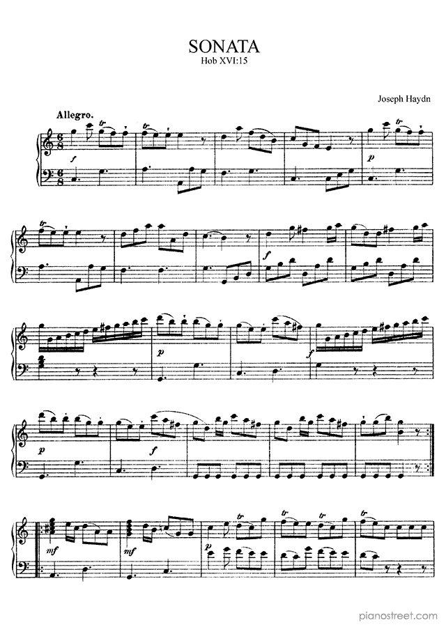 Classical piano sheet music by Joseph Haydn to download and print instantly: Sonata Hob. 16 No. 15 in the key of . Level 6, compositional type: Sonata (published in 1767)