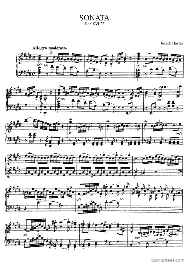 Sonata in E Major Hob. 16 No. 22 by Joseph Haydn. Sheet music and recordings of thousands of piano pieces by Joseph Haydn and many other famous composers to view in your digital device, print out or listen to.