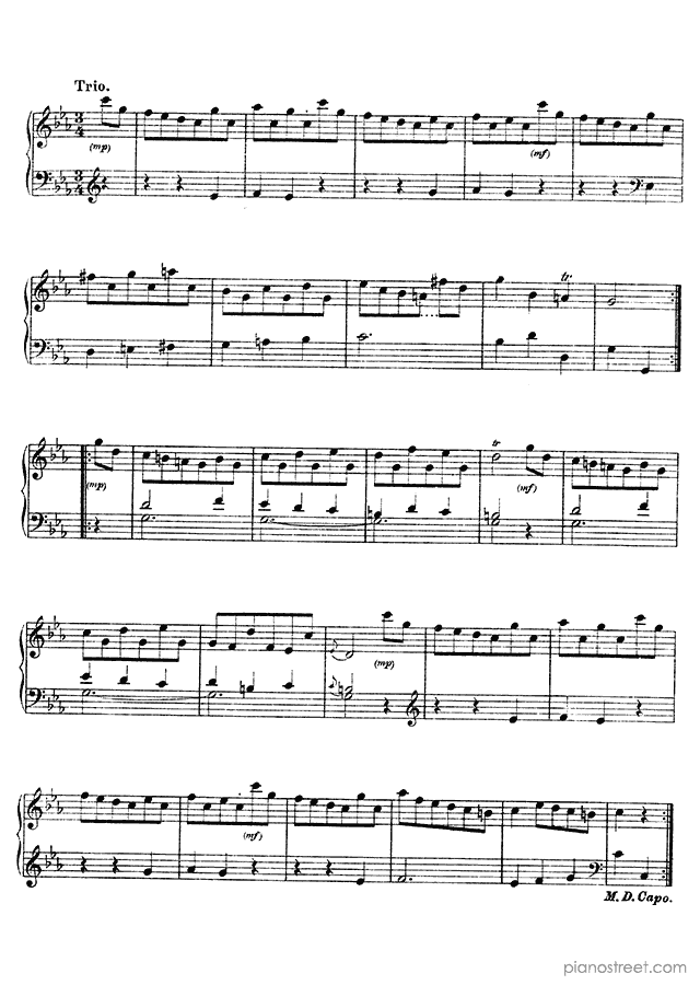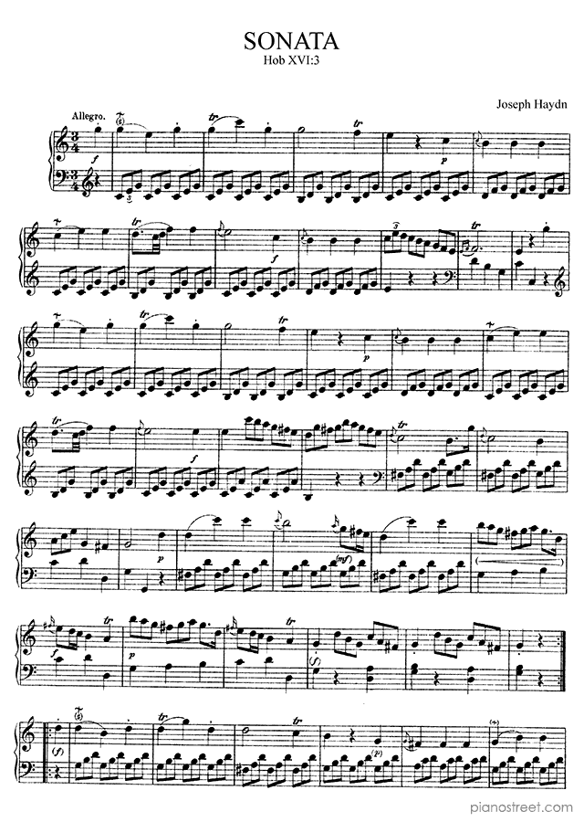 Classical piano sheet music by Joseph Haydn to download and print instantly: Sonata Hob. 16 No. 3 in the key of . Level 6, compositional type: Sonata (published in 1760)