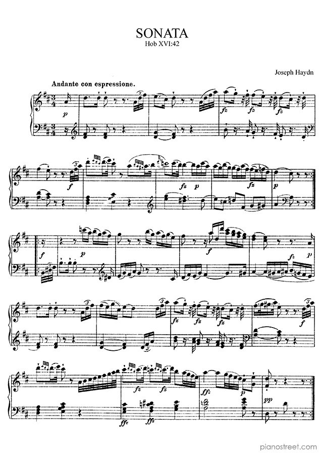 Haydn: Sonata Hob. 16 No. 42 in D Major (published in 1784) . DOWNLOAD piano sheet music from Piano Street digital sheet music library.