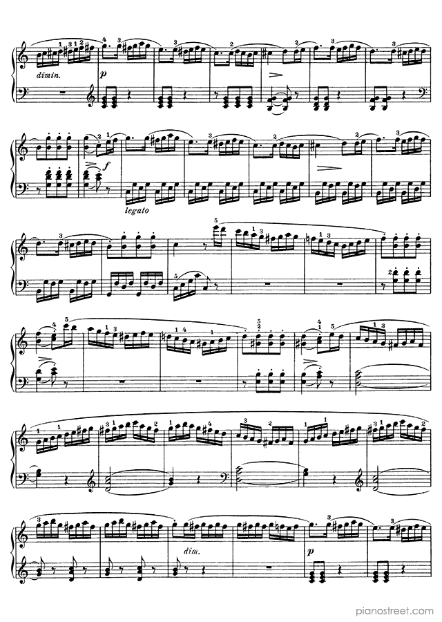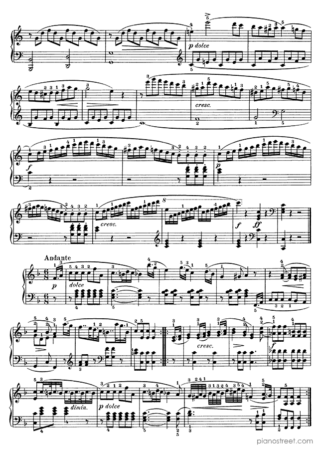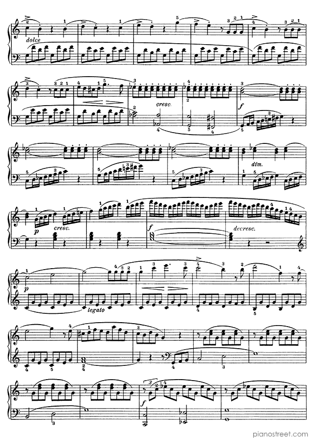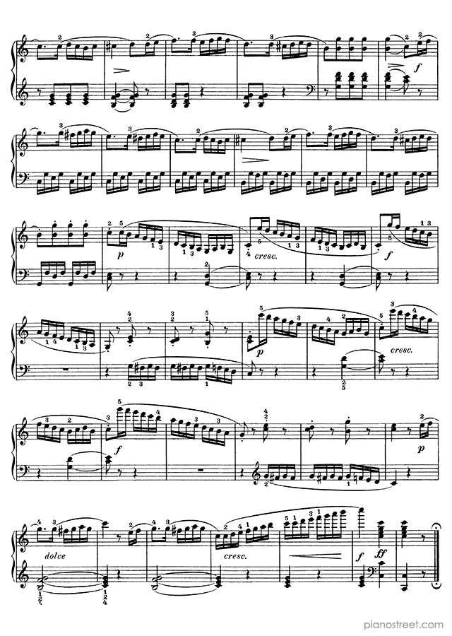 Friedrich Kuhlau’s Sonatina in C major Op. 20 no. 1 shows many stylistic parallels to Mozart’s sonatas, its opening measure deceptively similar to the opening of the Sonata in C major K. 545. The first movement makes use of dramatic contrasts between major and minor and between lyricism and elegant passagework. The lyrical second movement is short and peaceful, and the final movement is a good-natured rondo, featuring a middle section in minor which provides contrast before the return of the opening material.Background